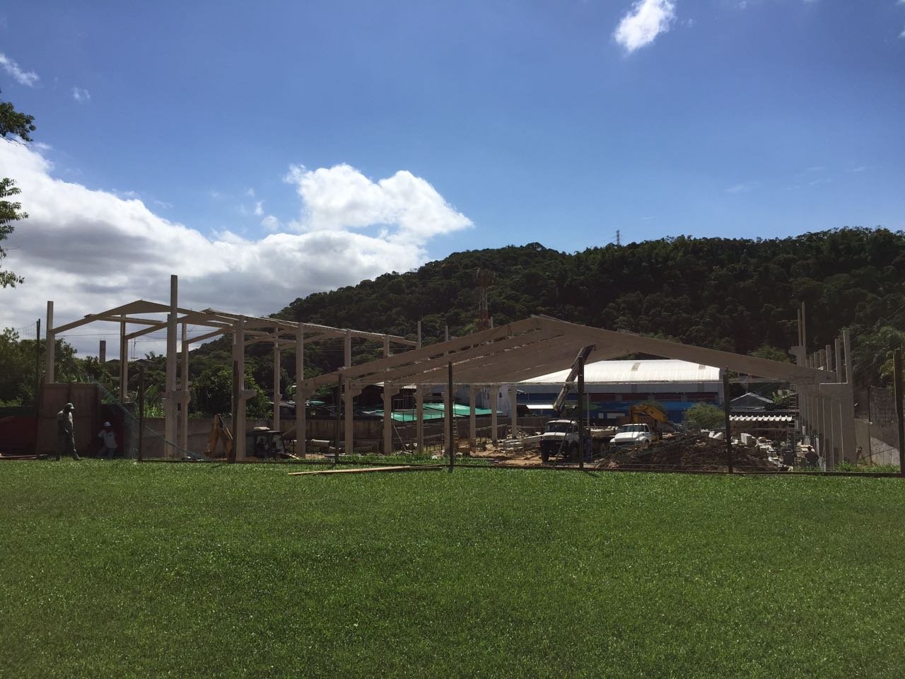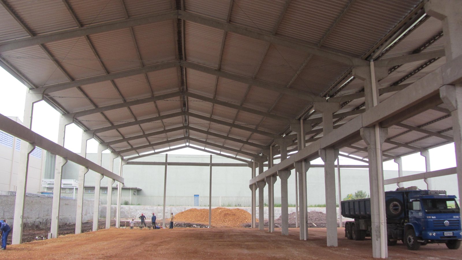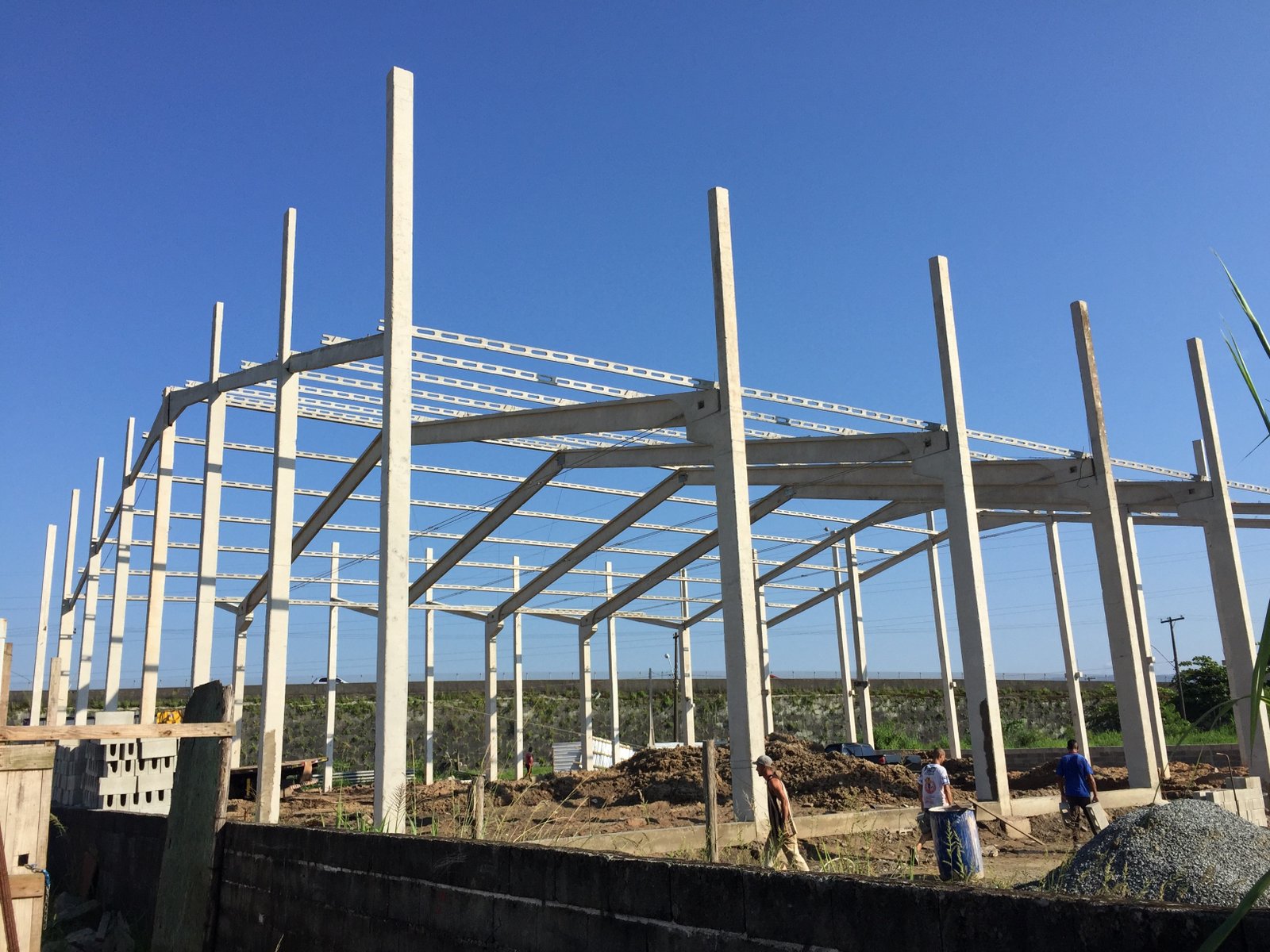 - Galpão para setor gráfico: estrutura 30x90x7,5m. Vão livre de 30m, com mezanino e laje, vigas de fachada e vigas superiores para auxiliar no fechamento e acabamento da obra.