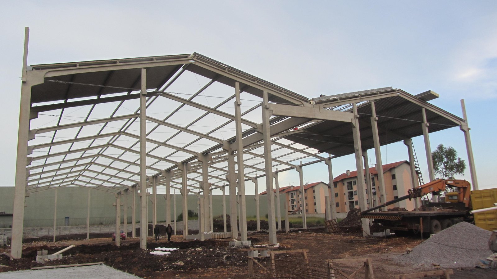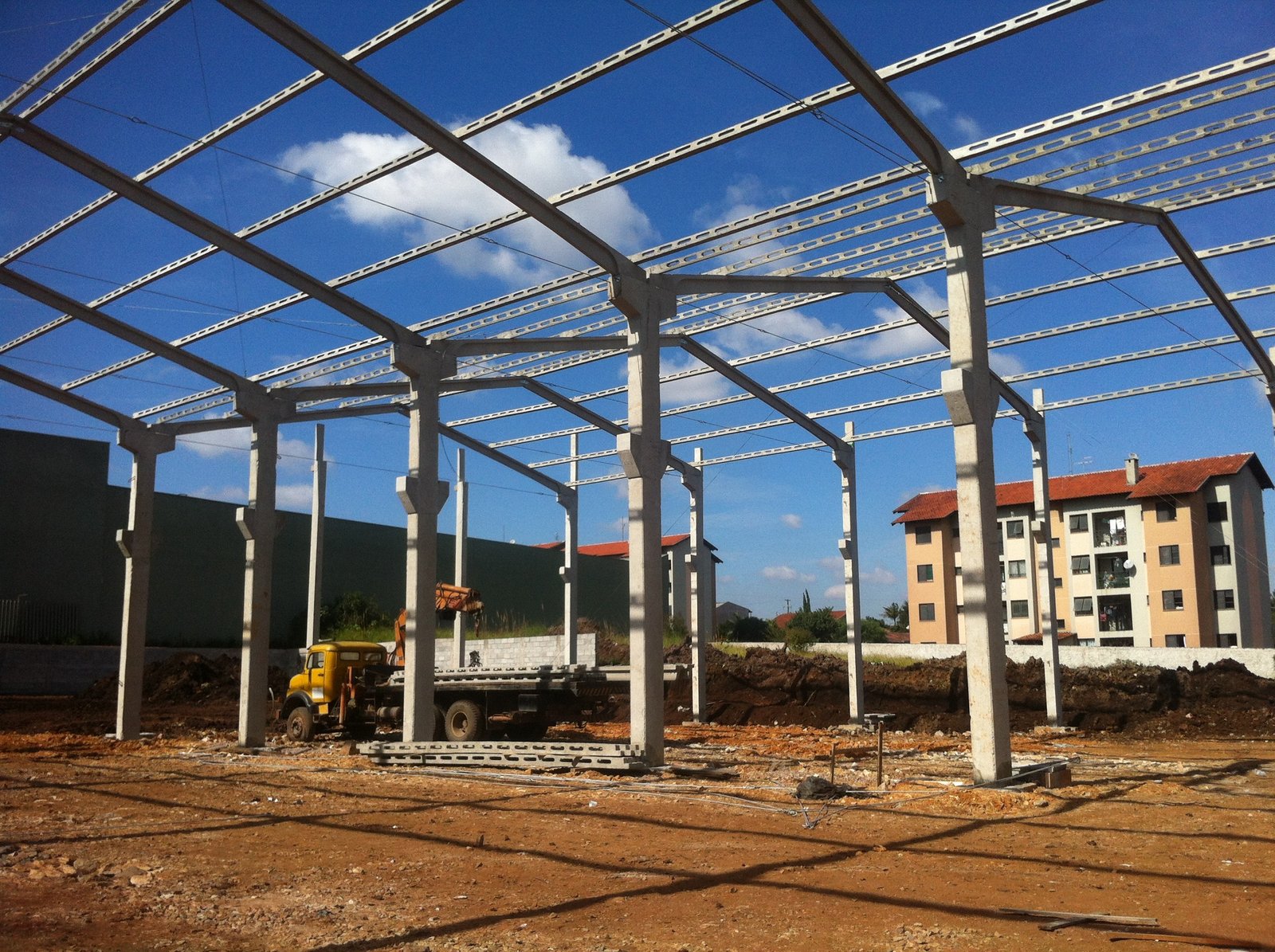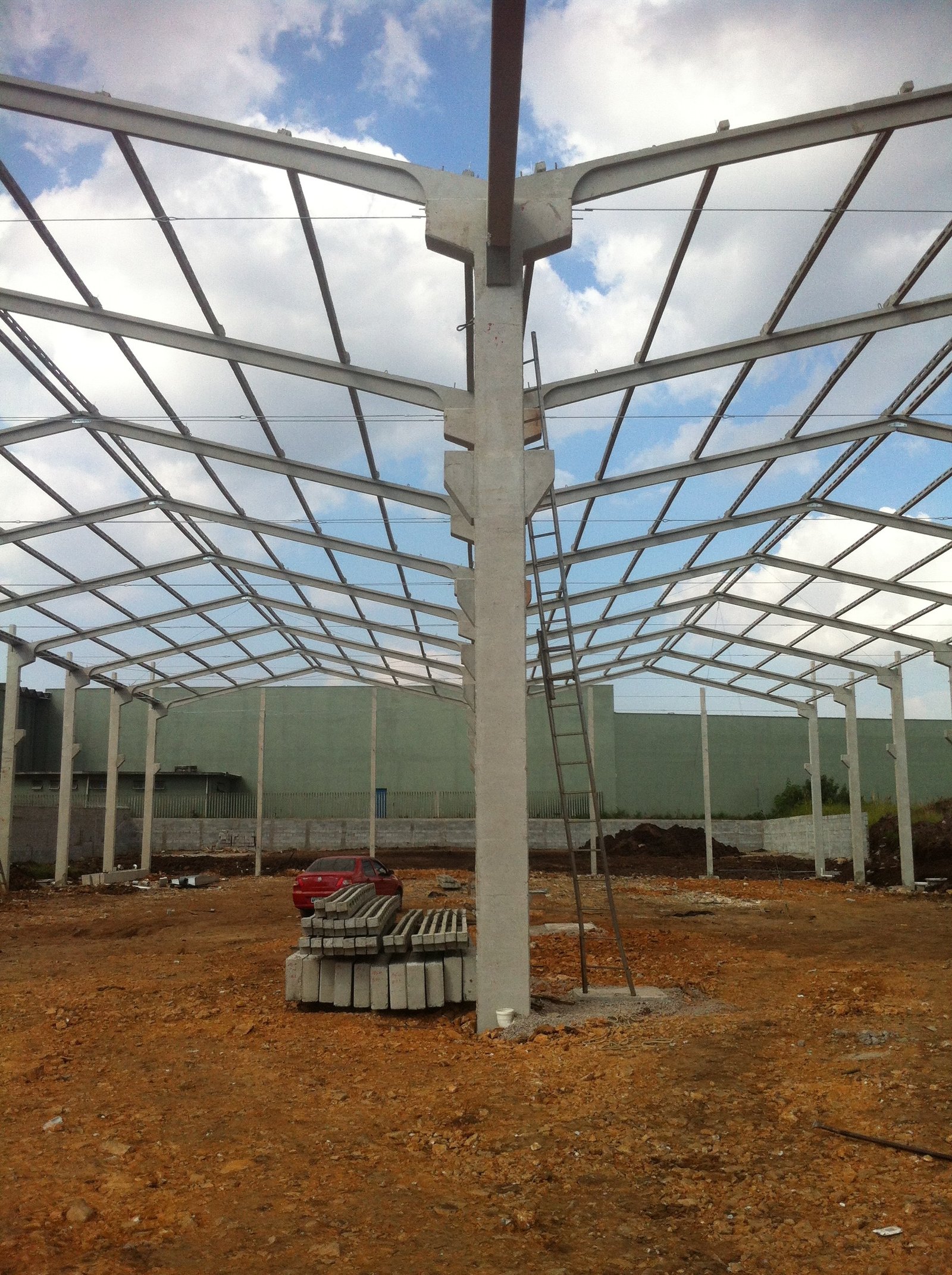 - Galpão para distribuidora de aço: estrutura geminada (dupla) 33x60x8m. Edificação com mezanino e laje em balanço, ponte rolante e vigas de transição (eliminando pilares centrais e ampliando a área livre de utilização).